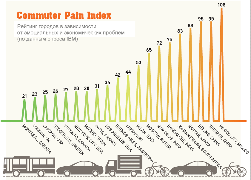 По данным за 2011 год отмечено 8 проблемных городов, которые относятся к городам с развивающейся экономикой и рынками: Мехико, Шеньчжень, Пекин, Найроби, Йоханнесбург, Бангалор, Нью Дели и Москва. Согласно исследованиям компании IBM в этих городах отмечено заметное превышение темпов роста развития бизнеса над темпами развития транспортной инфраструктуры. Иначе говоря, города не приспособлены обеспечивать должный уровень комфортных условий передвижения, что в результате сказывается сильно и массово на эмоциональном настрое каждого человека, задействованного в система бизнеса (дорожные пробки, проблемы парковок, медленное развитие линий и видов общественного транспорта и т.п.). На рисунке ниже показан рейтинг наиболее крупных урбанистических центров мира по показателю CPI (Commuter Pain Index), который вывела компания IBM (подробнее здесь).