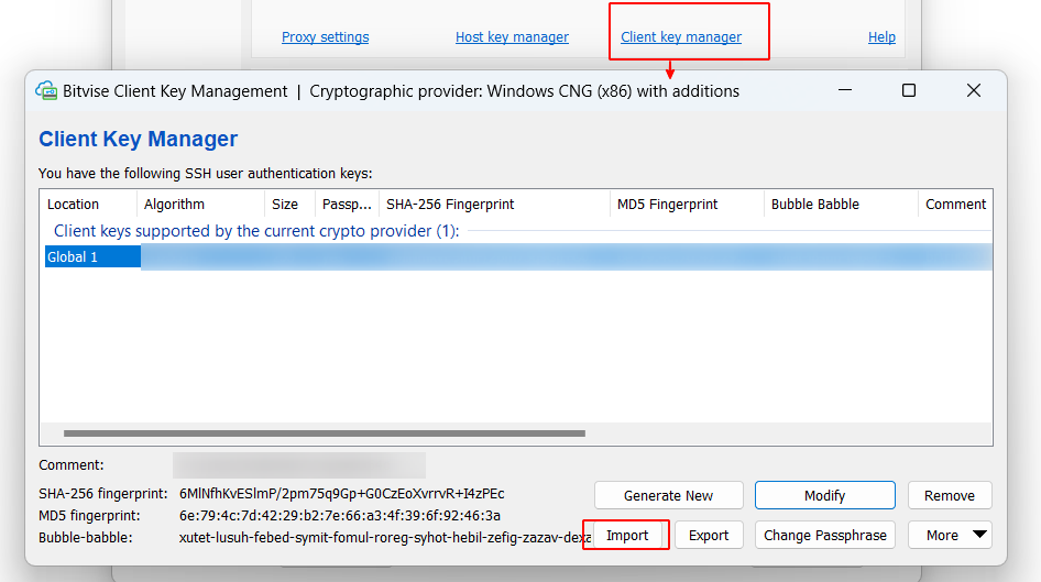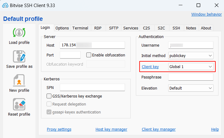 3) Далее надо импортировать закрытый ключ в профиль BitVise клиента, как показано на картинке: