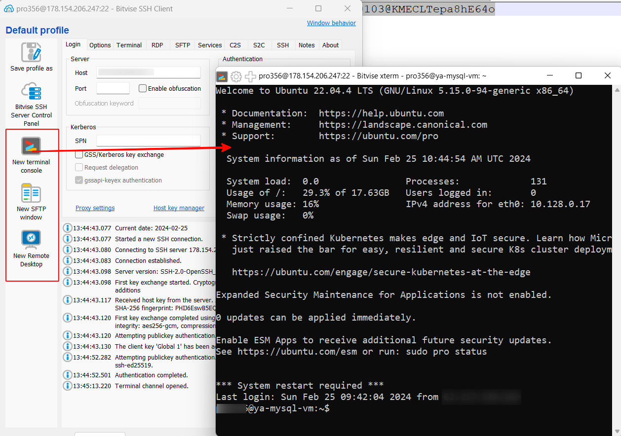 6) Если всё правильно сделали, можете нажимать кнопку Log In для создания терминальной сессии с вашей ВМ. Консоль BitVise достаточно подробно сопровождает информацией об организации соединения. Успешное соединение предоставит вам 3 новых кнопки в клиенте слева (как на картинке), вам нужно нажать New Terminal Console и вы откроете терминальную сессию вашей ВМ. Теперь можно работать с ВМ.