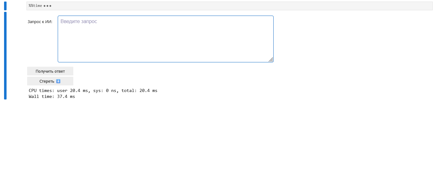 - Две кнопки: одна отправляет запрос к ИИ, другая очищает вывод.