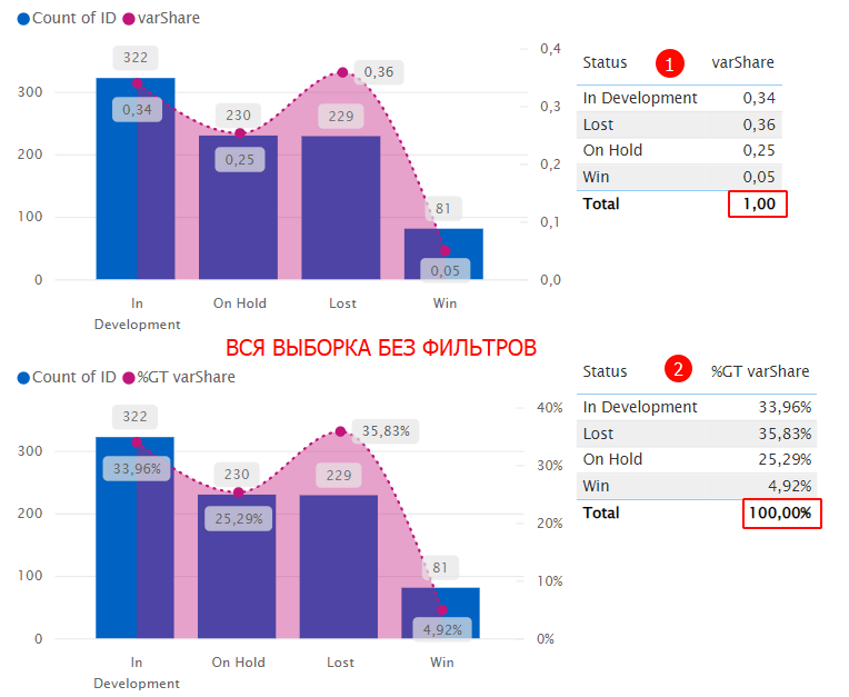 Когда вы создали меру (Measure), можно сопоставить его с полем для визуализации данных любого компонента. Если вы не применяете фильтры, то используете всю выборку ваших данных, и здесь нет проблем с визуализацией данных - суммы долей по категориям верно считаются и "бьются". Таблицы первого графика и второго имеют равные расчетные значения по долям.