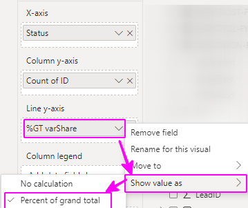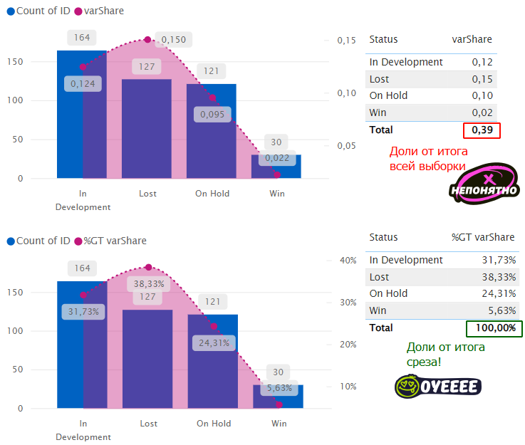 На верхнем графике доля без учета представления в %GT, т.е. доля от общего итога всей исходной выборки. А на нижем графике для измерения varShare применено дополнительное указание для представления как на рисунке.