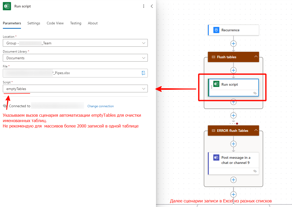 - Power Automate не всегда корректно отрабатывает команду применения скрипта при вызове, иногда это связано с особенностями работы с файлами Excel в облаке (блок файла от записи, чтения, нарушение прав владельца файла и т.п.)