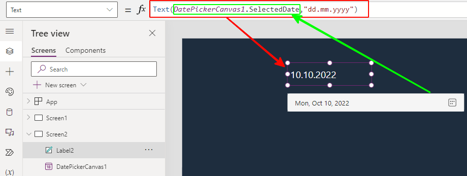 Таким образом, всякий раз при выборе даты, при нажатии на иконку DatePickerCanvas1 после выбора даты, будет обновляться значение текста у Label. Недостатком такого метода является невозможность прямого ввода даты, но им редко кто пользуется, если есть выпадающий календарь.